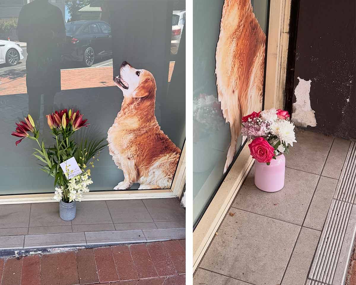 And in other news โ there have been flowers for Dozer left outside RTM (our food bank), beside the life-size sticker of him on the window. My team didnโt tell me about this until I came back to work this week, and of course this triggered a flood of tears as I was so touched.