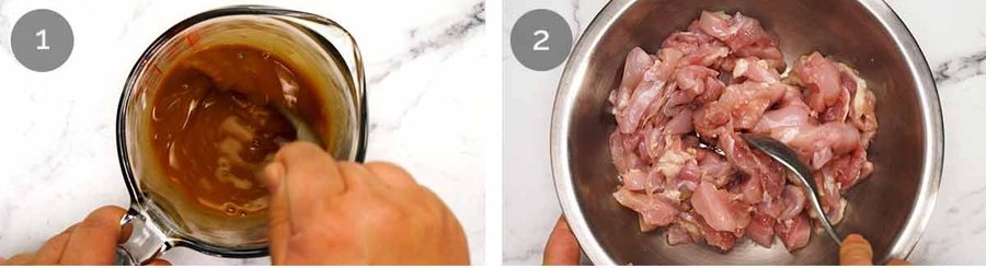 - Chicken โ Toss chicken with Chinese cooking wine and pepper.