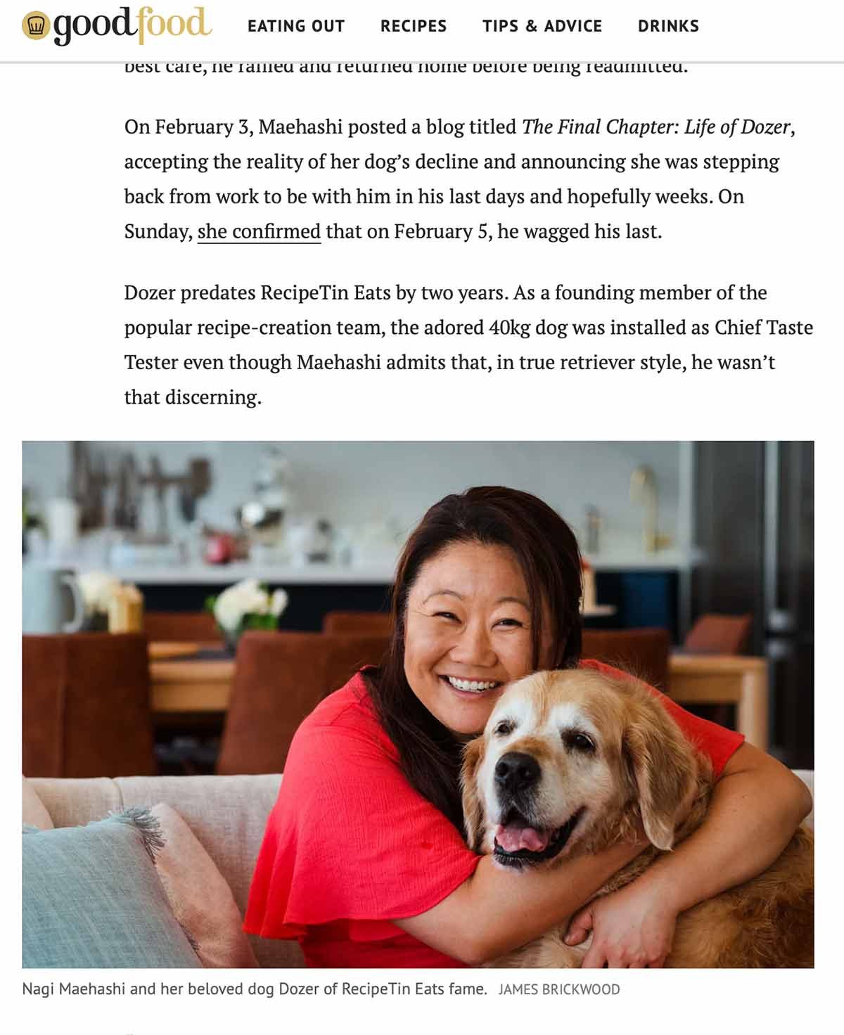 RecipeTin Eats is, first and foremost, a recipe website, and so Iโll be getting back to regular recipes. But for a while, Iโll keep his spirit alive with anย In Memory of Dozerย section at the bottom of each post. I started this website with him at my feet, and he was beside me for every recipe until the very end. I feel like Iโve lost my identity without him, but I know clarity will come with time, and sharing small Dozer memories is part of that.