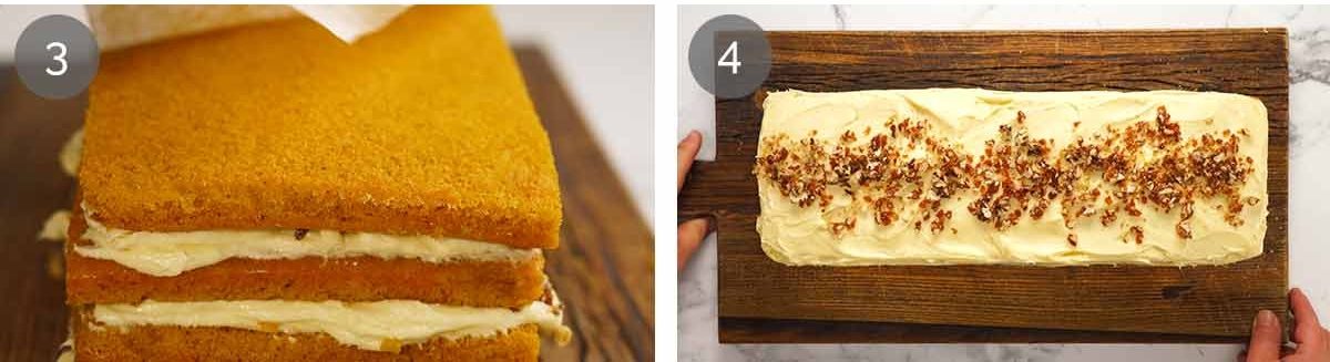 - Layering – Use the paper to transfer one piece on the cake platter. Spread with one-fifth of the frosting, sprinkle with about 1/4 cup of pecan toffee crumble. Top with another layer of cake (invert using paper, or use 2 long offset spatulas/knives/rulers to handle). Repeat twice more with frosting and pecan crumble.