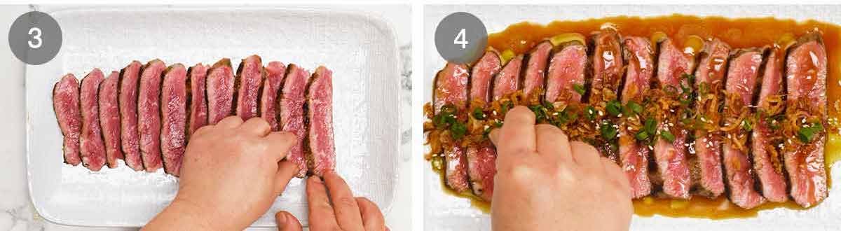 Slice – Rest then cool the steak for at least 1 hour, if time permits. Cool steak = easier to cut thinly. Though having said that, warm beef tataki is lovely!