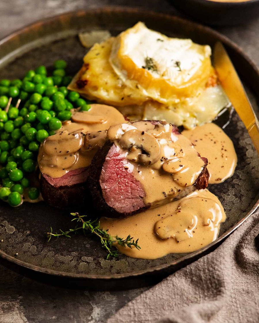 Creamy mushroom sauce – A special creamy mushroom sauce, an elevated version of the everyday mushroom sauce I use midweek, made using every drop of the precious pan drippings. There’s little drippings from tenderloin compared to other beef, so choosing the right sauce is important. More on the sauce below.