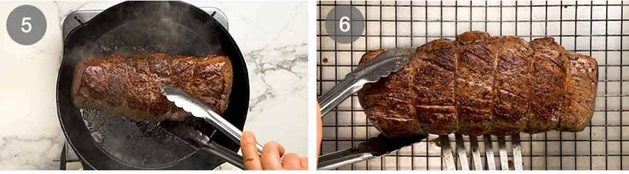 - Sear – Heat oil in an ovenproof heavy based pan over high heat until smoking. (Note 6) Brown the surface of the beef all over, aggressively and quickly. Then put the beef back on the rack to cool for 15 minutes (so the butter doesn't instantly melt when you put it on).