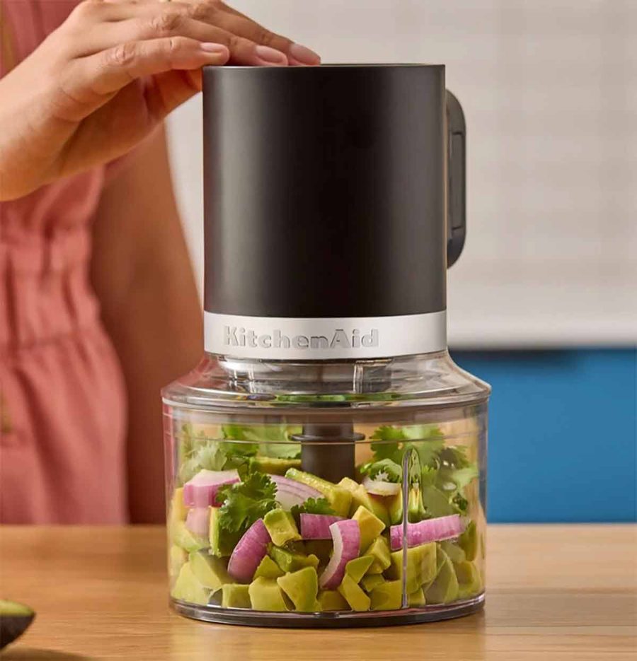 There is also a KitchenAid cordless food processor which holds 5 cups (1.25 L / quarts) which is a bit larger and heavier, and starting to head into counter-top food processor territory which is why I didn’t get it.