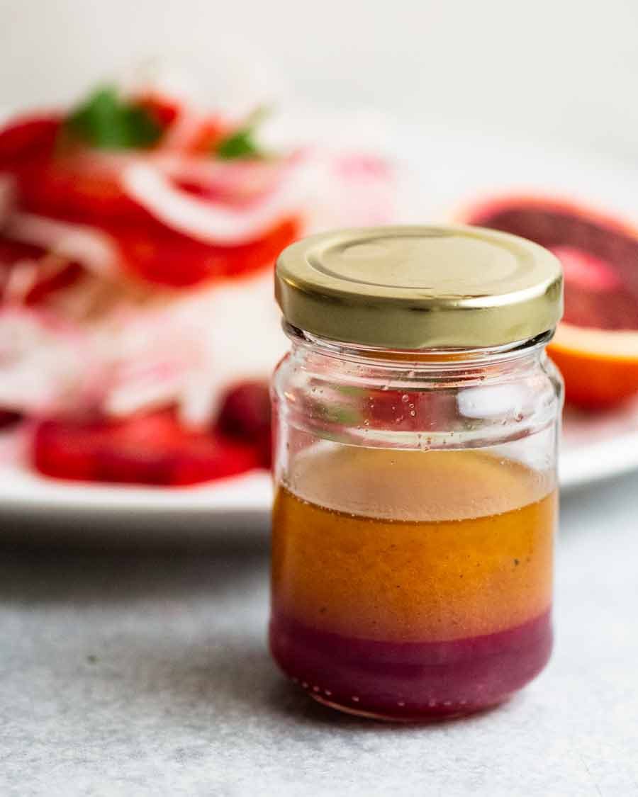 - Blood Orange Drizzle Dressing: Measure out 2 tsp pickling vinegar, shake/whisk with the reserved 2 tsp juice, 2 tbsp EVOO with a pinch of salt and pepper.