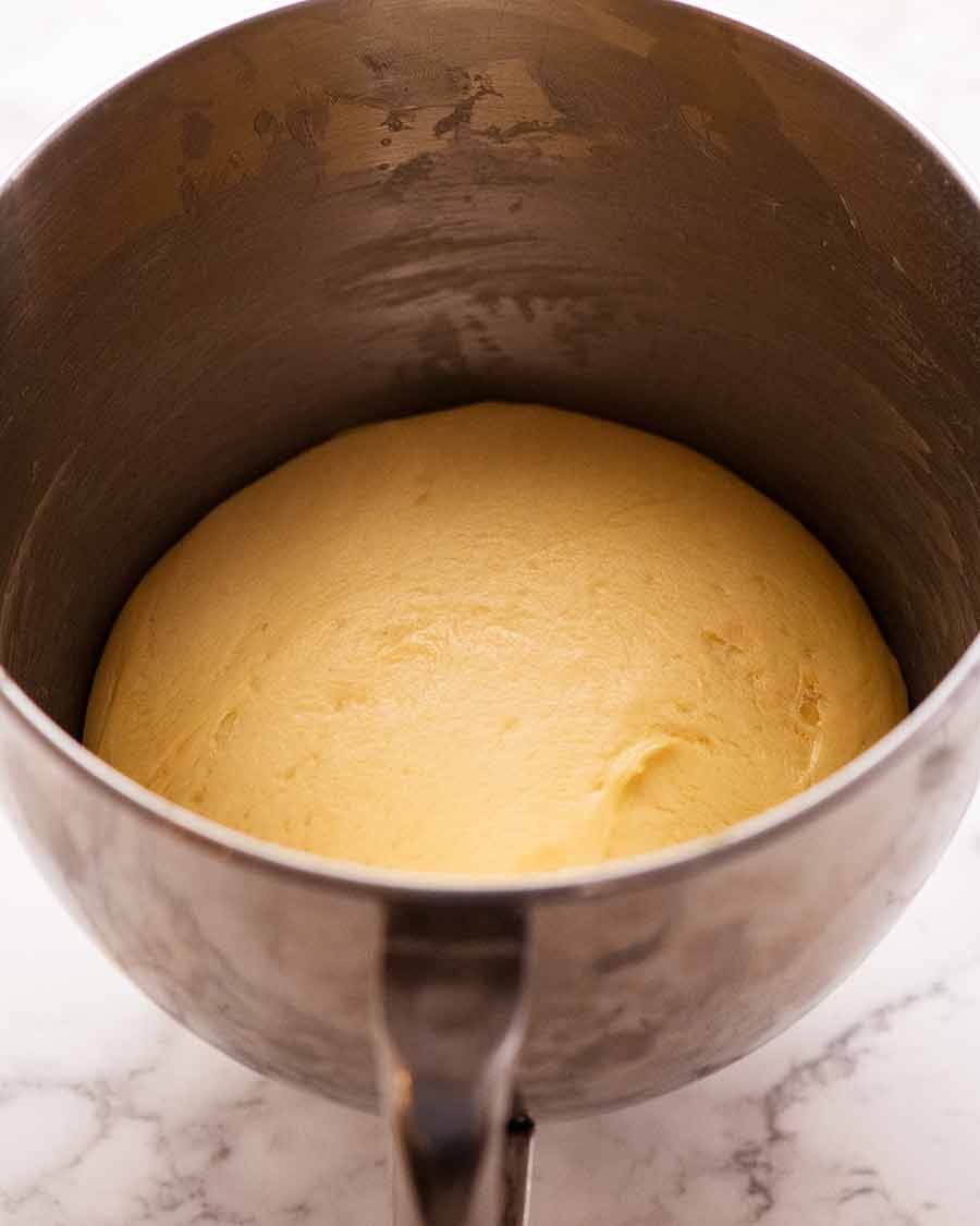 Rise #1 (2 hours): Shape the dough into a ball, put it back into the stand mixer bowl. Cover with cling wrap and put it in a warm place for 2 hours until it has doubled in size.