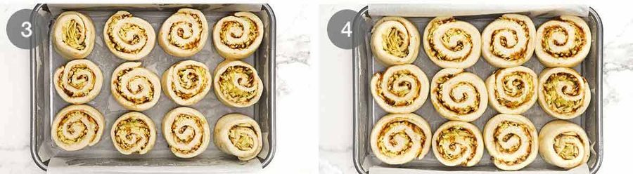 Bake for 25 minutes at 180°C/350°F (160°C fan-forced). Then rotate the pan and bake for a further 10 minutes at 200°C/375°F (180°C fan-forced) or until the cheese on the surface of the scrolls around the edge of the pan are light golden.