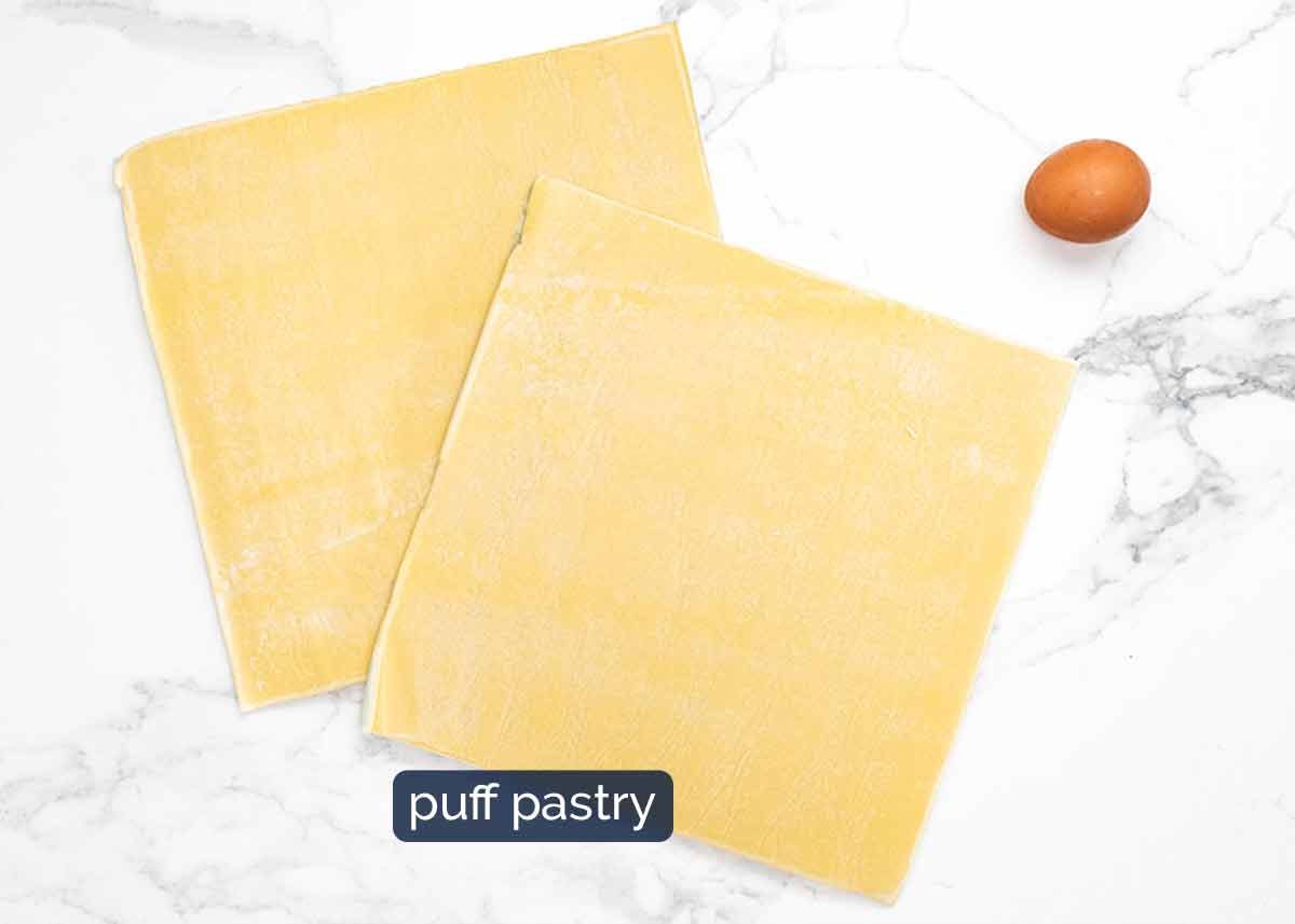 - Connect puff pastry sheets (if needed) – Semi-thaw the puff pastry (Note 6). Brush the edge of one sheet with egg white, then overlap 0.5cm / 0.2" with the other sheet to connect them. Use the back of a spoon to "smear" the pastry to hide the seam and firmly connect.