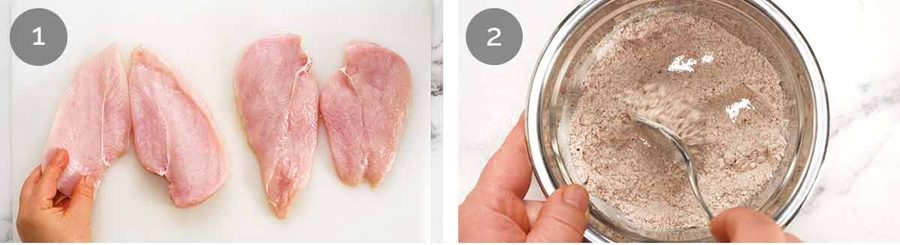 Split each chicken breast in half horizontally to form 4 thin steaks in total. To do this, apply pressure by placing your palm down on the breast then cut through the chicken.