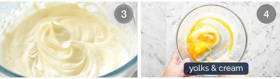 - Yolks and cream – Fold egg yolks into cream using a rubber spatula – 8 folds max. Some streaks is fine.