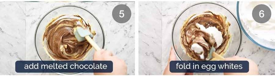 - Fold in egg whites – Add 1/4 of beaten egg whites into chocolate mixture. Fold through until incorporated – "smear" the spatular across surface to blend white lumps in – aim for 10 folds.