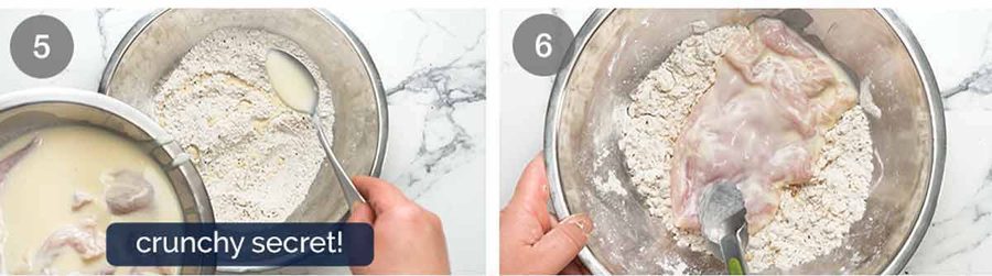 Marinade flour clumps – This is the trick to the ultra crunchy chicken! Drizzle 2 tablespoons of the marinade into the flour mixture then use your fingers to mix it in. The flour will form little clumps.