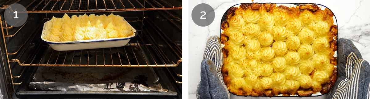 No piping bag? No worries! Just snip off the corner of a ziplock bag and pipe smooth mounds. Else, spoon little lumps all over the surface (try to give them height!) or do a regular Cottage Pie topping (spread mash, rough up with fork).