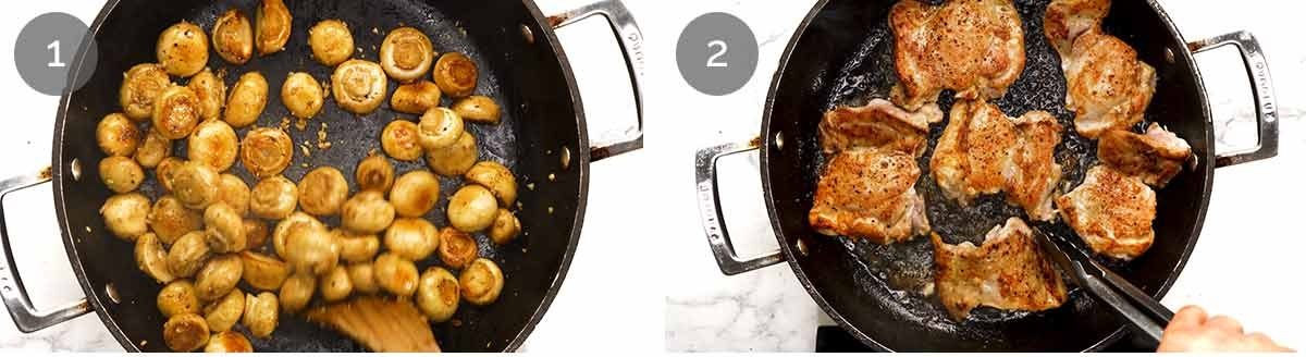 Garlic butter mushrooms first – Melt butter on high heat, add mushrooms and stir for 3 – 4 minutes until lightly coloured but still firm – they will finish cooking in the sauce. Add a bit more butter, melt, toss to coat, then add garlic, salt and pepper. Cook 20 seconds until garlic is golden, then transfer to a bowl, scraping out all the garlic bits (or they’ll burn).