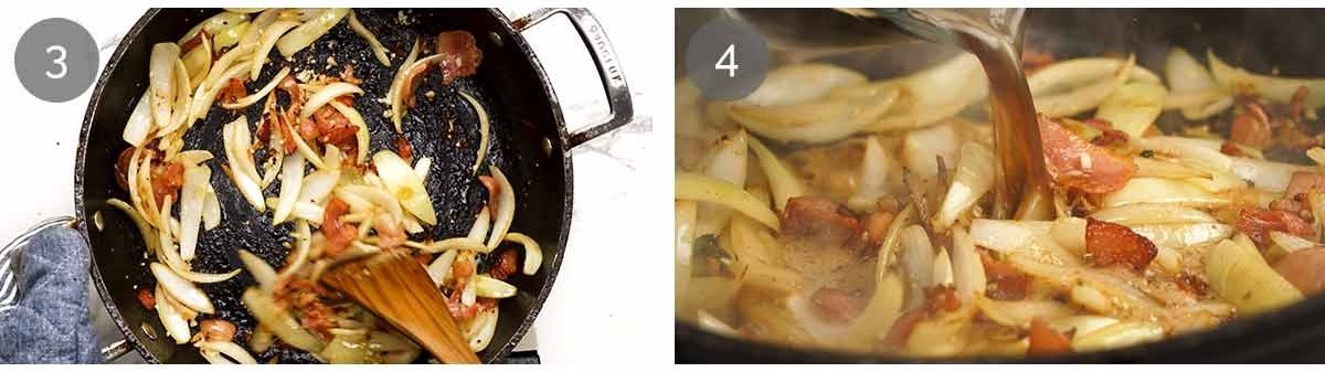 Bacon and onion – Lower the heat slightly so golden bits stuck on the base of the pan don’t burn. Give the bacon a head start – cook for 20 seconds, then add the onion and cook until it’s starting to soften (~ 2 minutes). Add garlic and cook for another 20 seconds until golden.