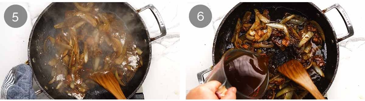 - Sauce – Lower heat to medium and add remaining butter. Once melted, sprinkle flour all across the surface and stir for 1 minute – it will look pasty. While stirring, pour in half the stock. Keep stirring until the flour paste dissolves into the stock, for lump-free sauce (yay!). Then add remaining stock, water, tomato paste, 1/4 tsp salt and 1/2 tsp pepper, stir well.