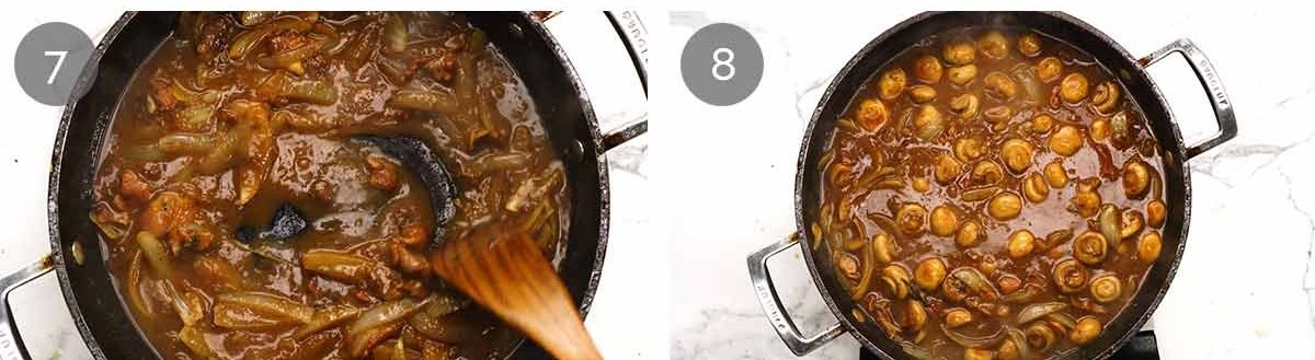 Simmer mushrooms – Then pour the remaining beef stock in, plus the water, tomato paste, salt and pepper. Stir to combine (it should be quite thin and watery) then add the mushrooms. Simmer for 10 minutes. During this time, the mushrooms will cook and the liquid will reduce and thicken into a gravy.