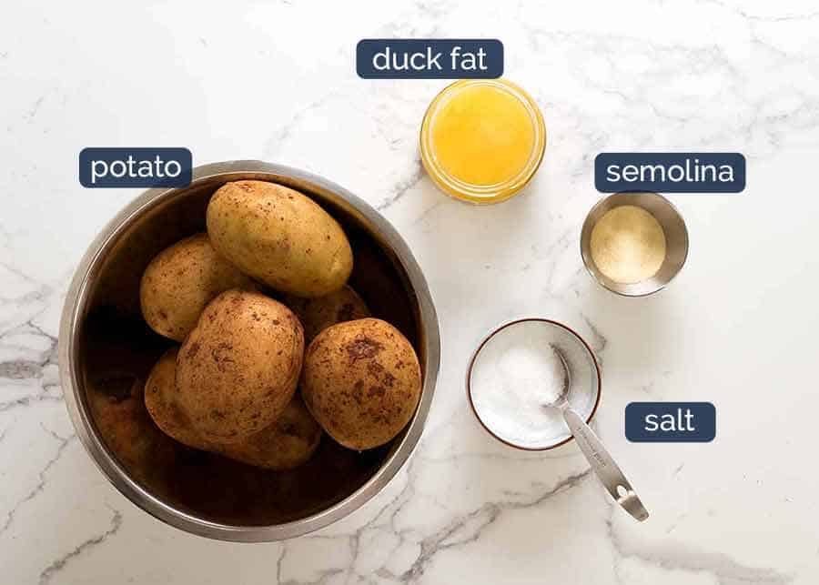 Semolina – a little secret ingredient for subtle extra crunch, learnt from Nigella! Semolina is a coarse ground yellow wheat that’s used for making (amongst other things) pasta. It’s the perfect size to “meld” into the coating of the potatoes so you can’t taste it separately but you get the benefit of the extra crunch. If you can’t find it, leave it out. There’s really no substitute – even fine ground cornmeal is too coarse (I’ve tried). Don’t worry, it’s like that extra little finishing touch – but I’ve made duck potatoes plenty of times without (and 99% sure most restaurants do too!