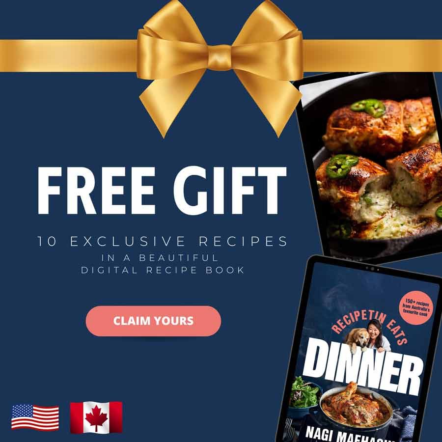 This bonus recipe book offer is one way I am trying to make it up to people who have been forced to wait. It’s a small gesture to our US and Canadian readers to say thank you for your support by pre-ordering my book and your patience waiting 4 whole months before you receive it, all the while having to see and hear all about the recipes Australians are already enjoying from “Dinner!”
