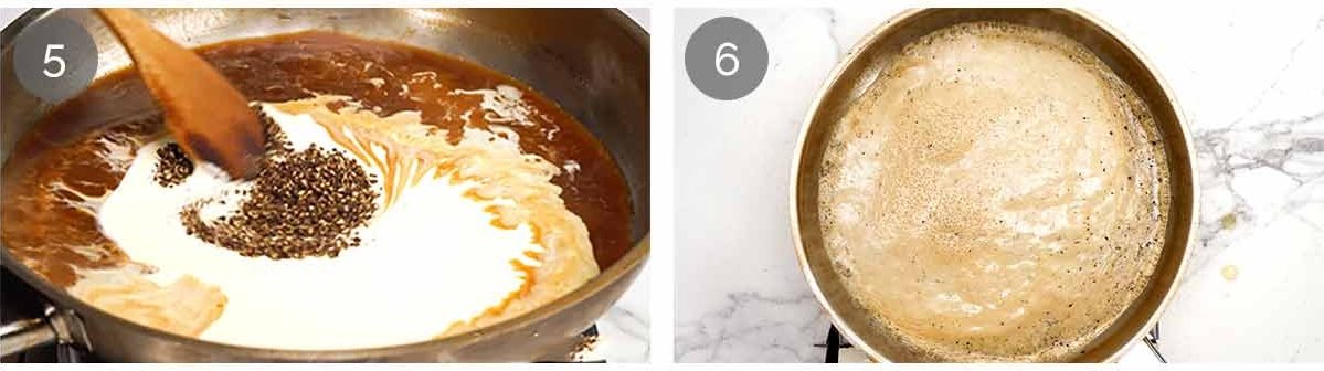 - Beef stock – Turn the heat back on high. Add beef stock. Simmer rapidly for 4 minutes, until reduced by half.