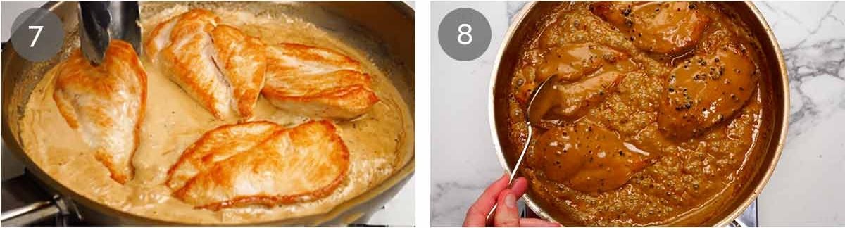 - Simmer – Turn heat down to medium. Return chicken and resting juices to the pan. Cook 2–3 minutes, spooning the sauce over the chicken, until it is warmed through and the sauce darkens in colour and thickens a little more. When you drag a spoon through the pan, the sauce should slowly flow back together. If it thickens too much, add a splash of cream or water to loosen.
