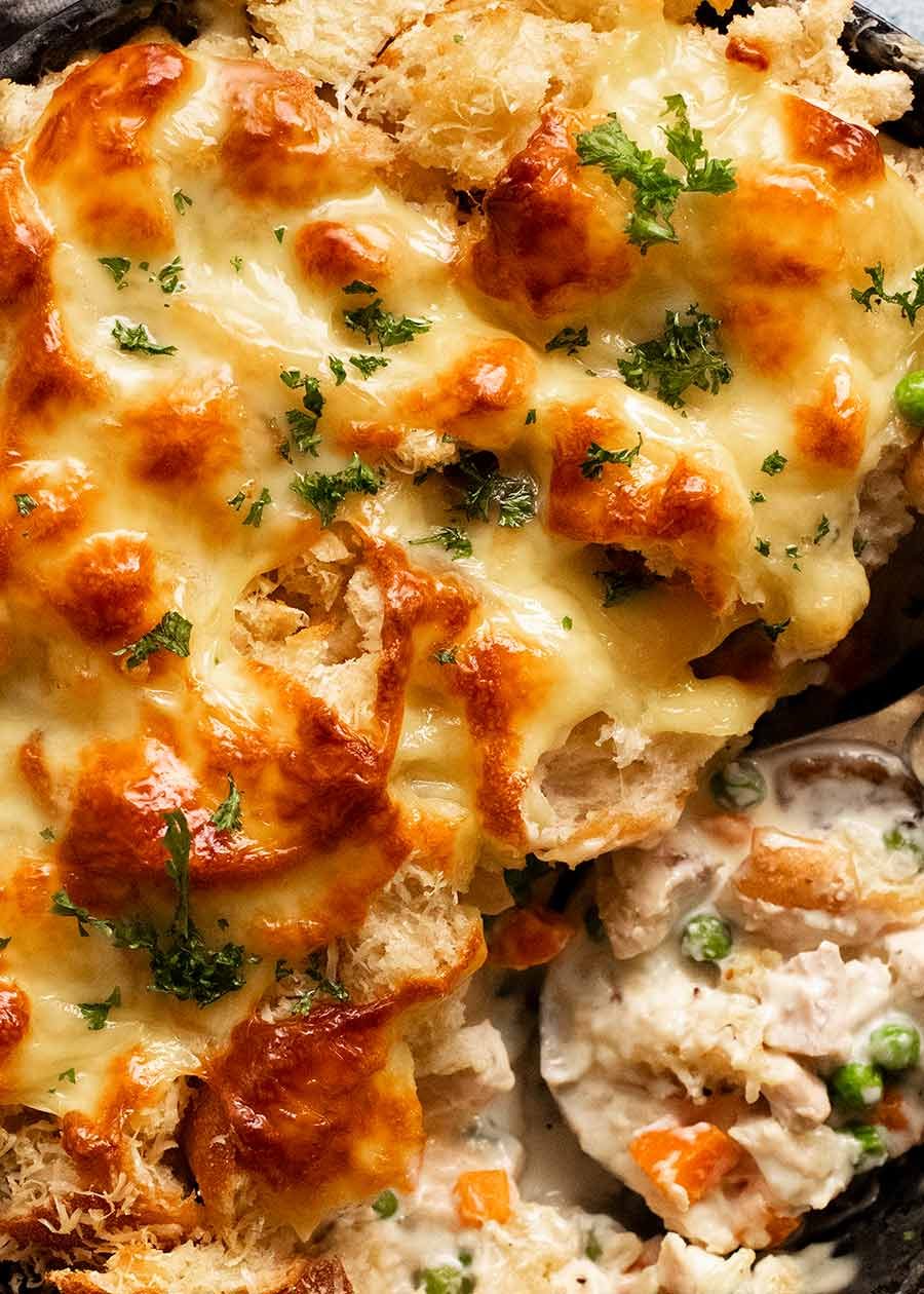 Mmmmm, that combination of creamy filling and that buttery, cheesy garlic bread topping… it’s to die for!