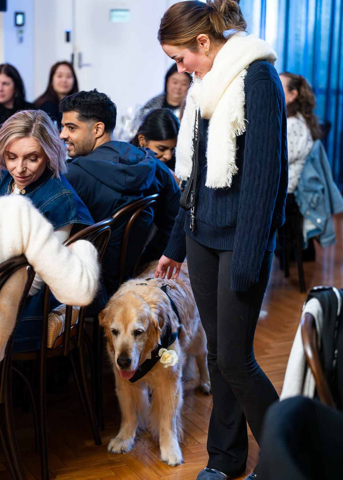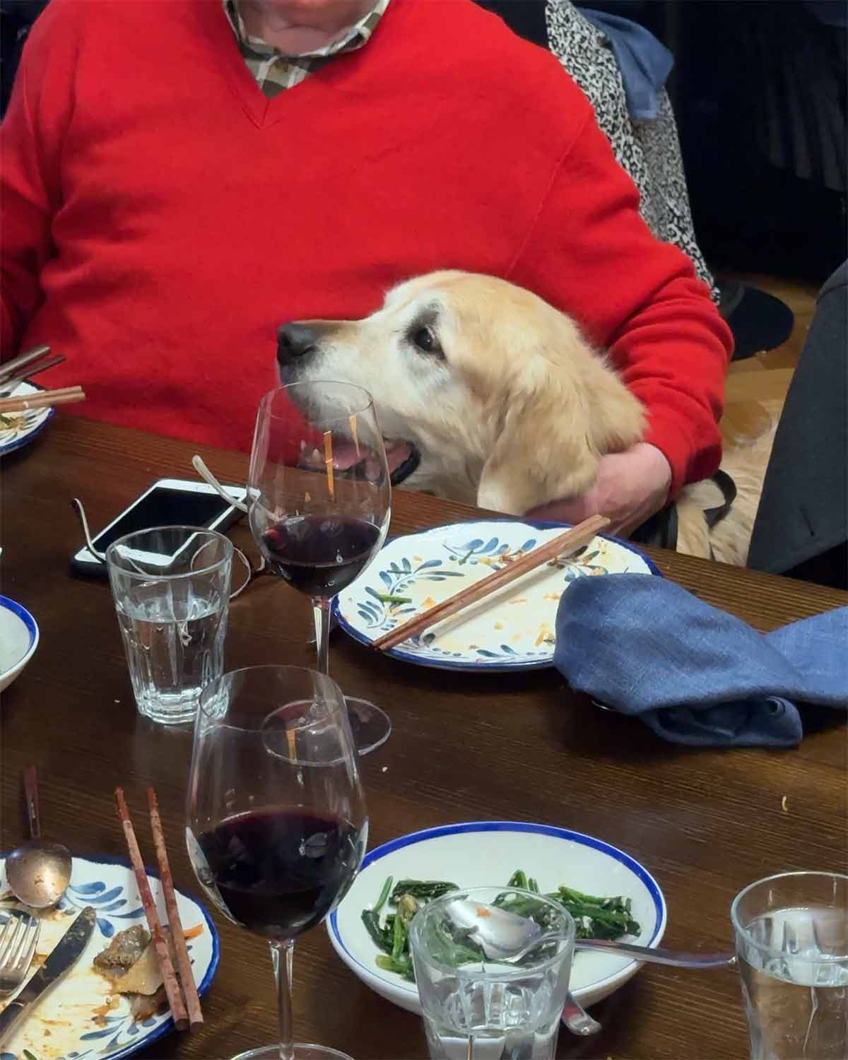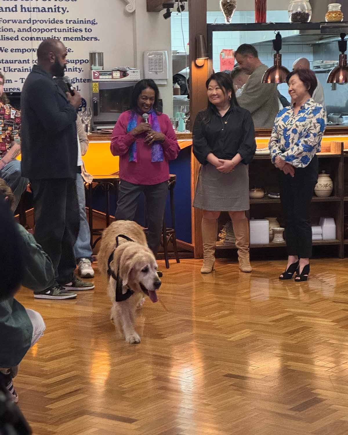 These days, I take a dedicated Dozer handler to events – for his own safety as well as the safety of guest meals, leaving me free to chat to guests without fretting about Dozer. This is Sofie, my assistant’s daughter, who did a brilliant job as Dozer’s handler at the Mum Cha event!