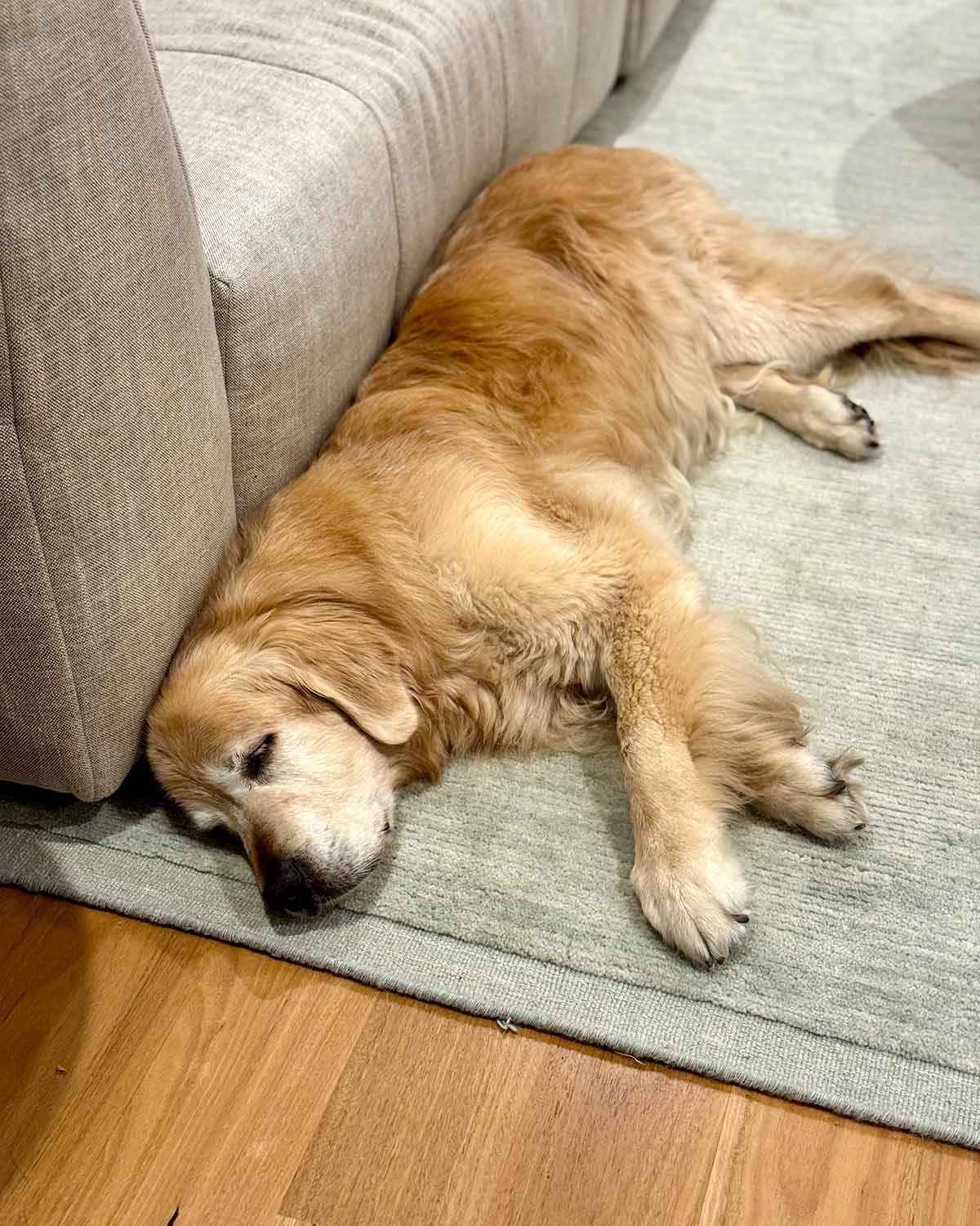 With Dozer well into his senior years (he’s 13 years young!), he usually runs out of puff early on these days. He waddles around sidling up to everyone for a pat, but needs to flop regularly to recover.
