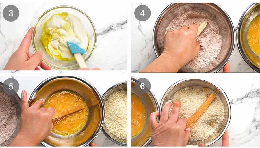 - Prep โ Using 3 bowls large enough to toss the halloumi, put the eggs in one bowl, mix Flour Dredge in another and mix Crumbing ingredients in a third.