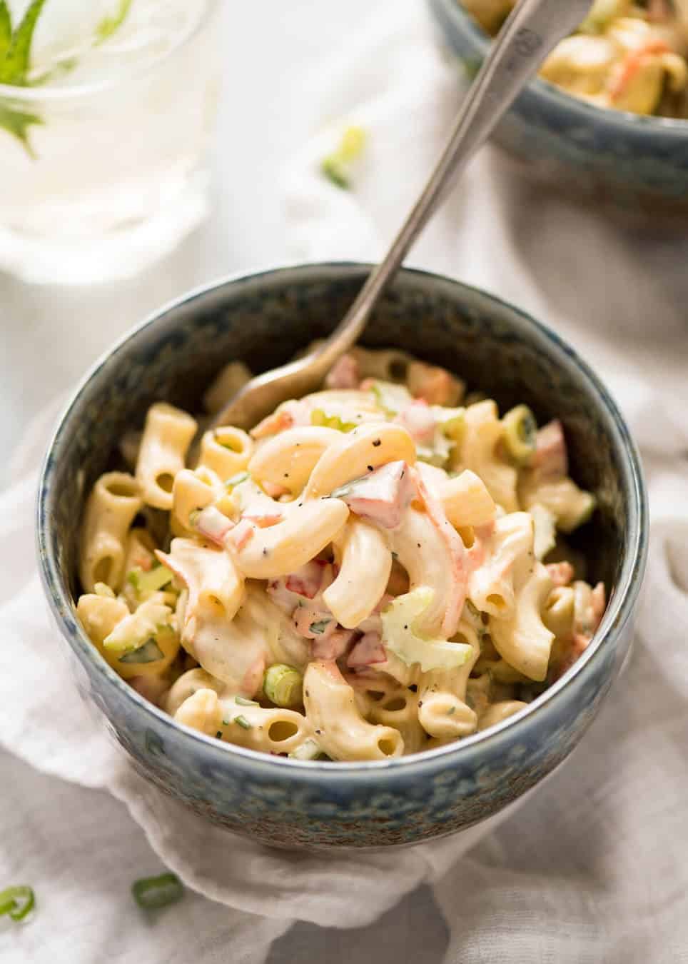 With a pasta salad dressing made with a combination of mayonnaise and yoghurt, it’s still beautifully creamy with all the flavour and less guilt! For a healthier option, try this Macaroni pasta salad with a mayo-free Creamy Lemon Dressing or Ranch Dressing!