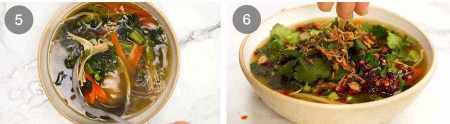 The soup broth is my master Chinese soup broth that is made with Asian pantry staples, flavoured with soy sauce and infused with garlic and ginger. It is the same I use for my classic Chinese noodle soup and rice soup.