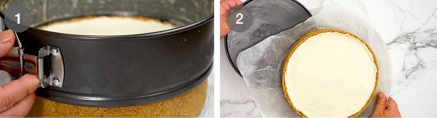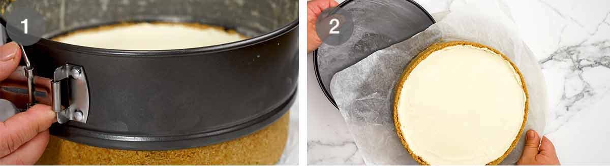 To make it easier to remove finished cheesecake, flip the base of the springform pan so itβs upside down. Why? Because this way you donβt need to worry about bumping the cheesecake over the lip of the base which could cause cracks in the crust. Instead, it will glide off smoothly!