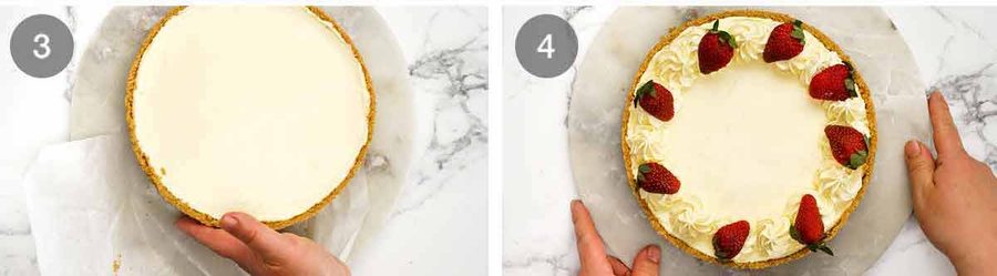 Decorate (optional) β If youβd like to decorate your cheesecake as pictured in this post, pipe whipped cream along the edge then top every second swirl with a halved strawberry. See below for more decorating ideas.