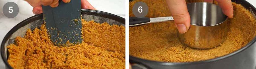 Press and neaten β Use something with a flat base and vertical walls (I use a measuring cup) to press the crumbs firmly into the walls and the base. It will seem a little fragile at this stage but once the filling is in and the cheesecake has been refrigerated, the crust becomes firm and crispy.