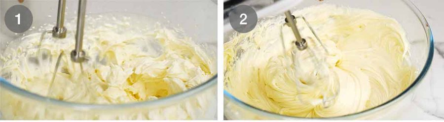 Beat cream cheese β Put the cream cheese and sugar in a separate bowl and using the same whisk (no need to clean it), beat for 1 minute on high just until itβs softly smooth. Then add the vanilla, lemon, salt and melted cooled gelatine, then beat it in just until dispersed.