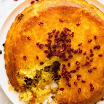 The key to this recipe is a yogurt-egg-oil-saffron mixture that is mixed with par boiled rice, then layered with barberries in a pie dish and baked until crispy on the outside.