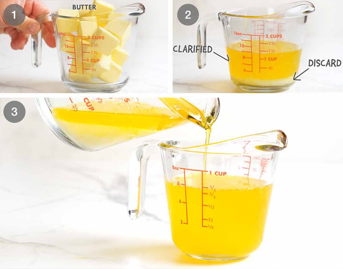 - Melt the butter in a saucepan or microwave. Set aside for 5 minutes until the milk solids settle on the bottom (white stuff). Scrape off the foam, then slowly pour the clear golden butter through a small sieve into a jug while leaving the milk solids behind (discard it). That clear golden butter is your clarified butter.