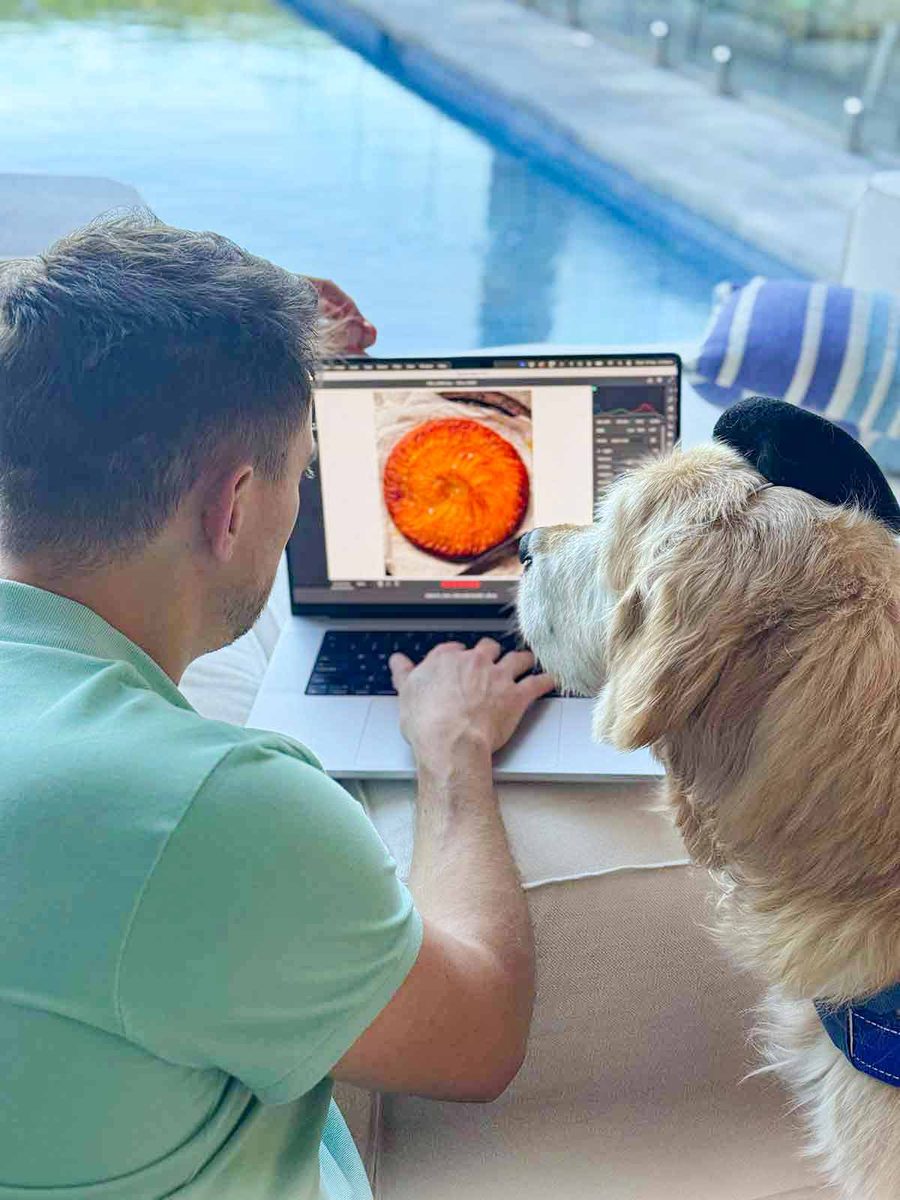 Dozer pretending he’s here for creative input, not snacks.