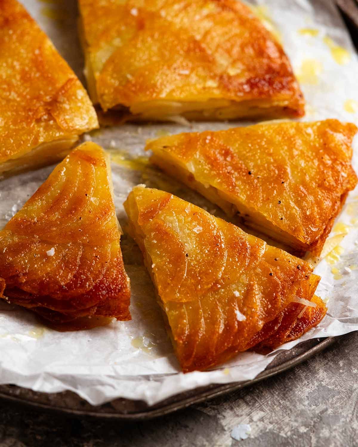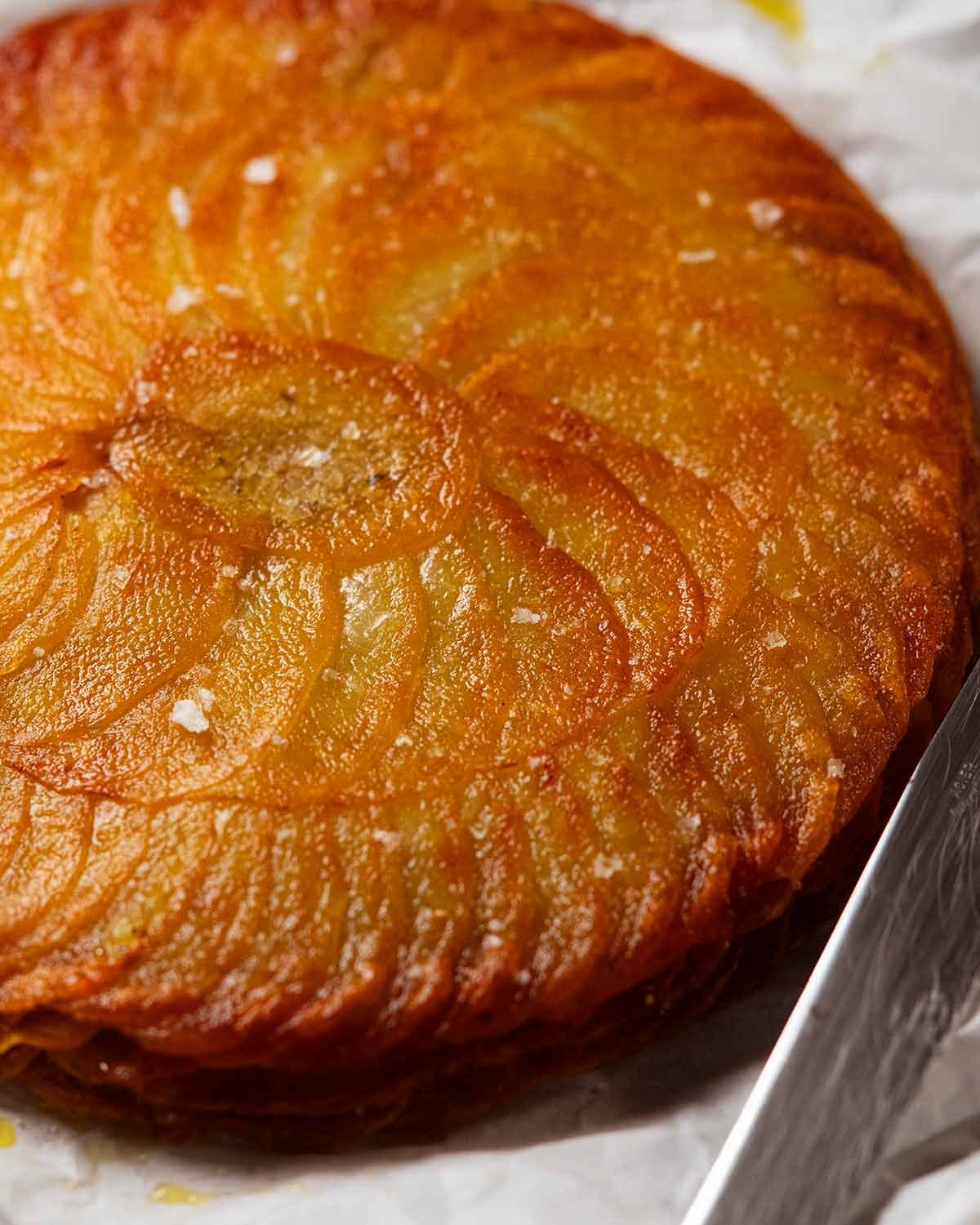 - Build 3 layers of thinly sliced potatoes (1.5mm / 0.06") in a spiral pattern brushing with clarified butter and seasoning as you go. Bake 70 minutes at 200°C / 400°F (180°C fan) covered with cartouche then 30 minutes uncovered. Rest 10 minutes, flip, and enjoy!