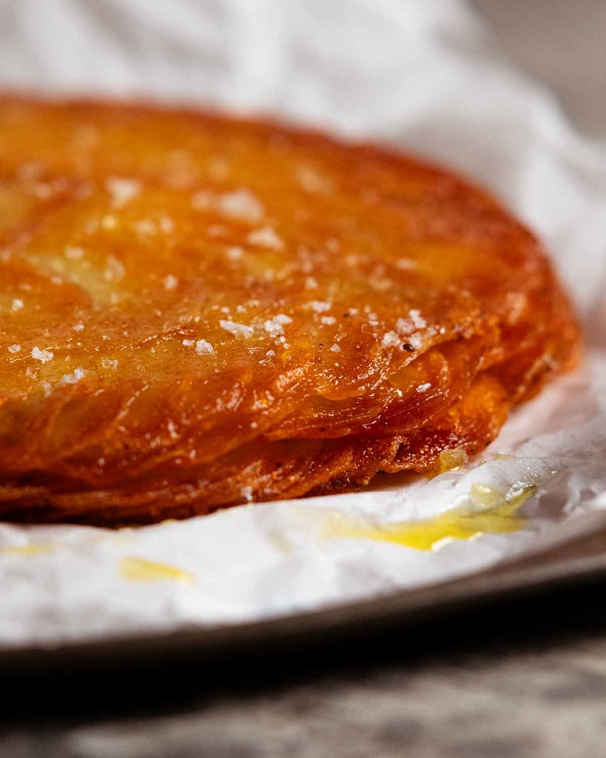 8. Flip it onto a plate, lift the pan and enjoy that moment when the golden layers appear. Now it’s time to get your fork out and dig into this beautiful Pommes Anna!