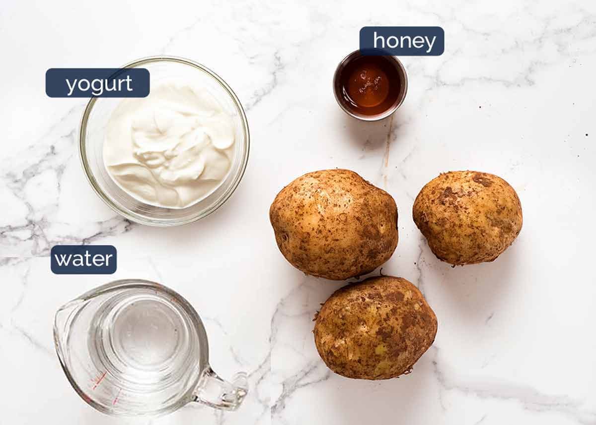 The trick here is to cook the potatoes until very, very soft – literally fall apart – so when you “whip” it up with yogurt, water and honey, it will become smooth with a fluffy buttercream frosting consistency!