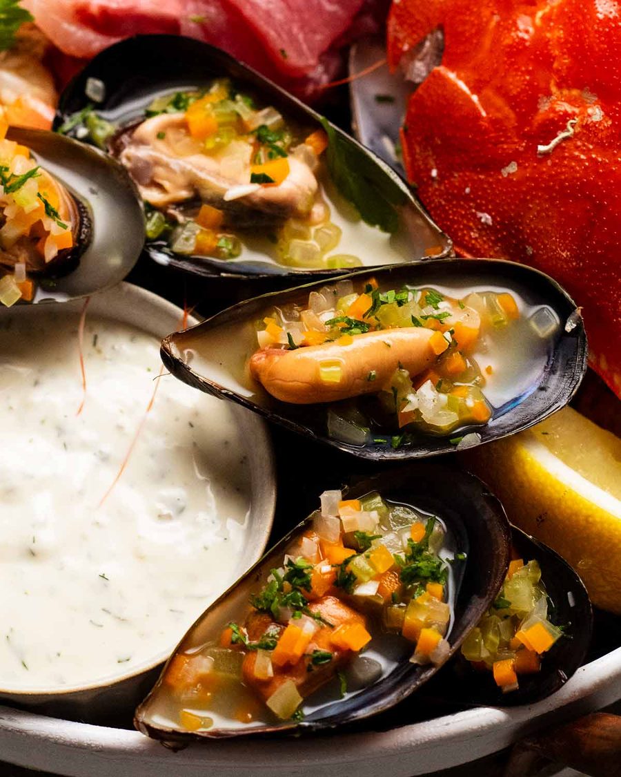 A recent addition to our cold seafood platter: cooked mussels served at room temperature. It’s so good! They present nicely if you dice up the vegetables really small so you can scatter them on the mussels for presentation purposes. Serve them in the half shell, spooning some mussel cooking liquor sauce into the shells to keep them moist and add some lovely extra flavour.