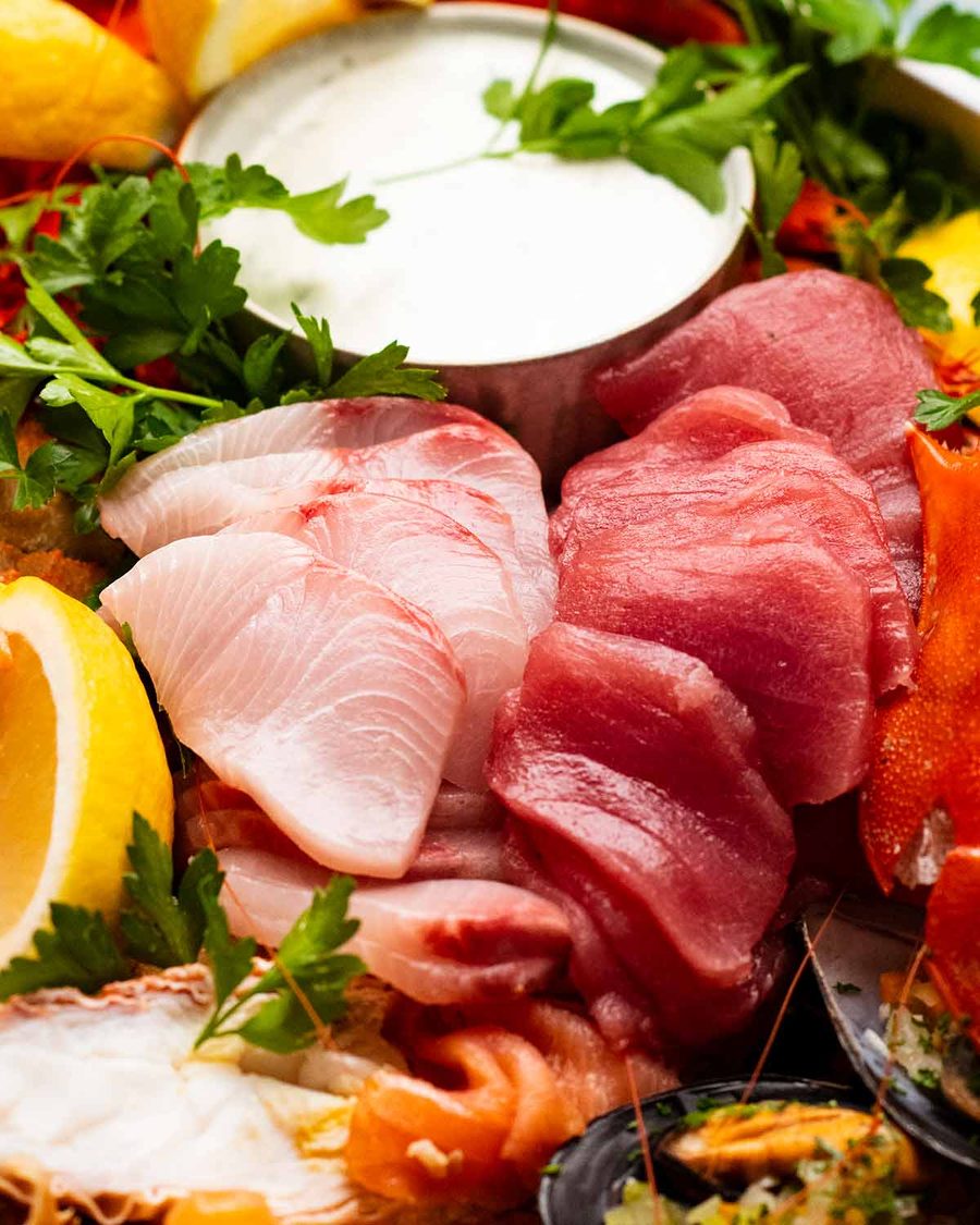 There’s no need to get loads, just a little bit, for extra variety in the platter amongst all that shellfish. We just go to the sashimi bar at the Sydney Fish Markets and get what looks good or what we feel like. Kingfish, tuna and salmon are favourites, but we love to mix it up if there are other interesting fish varieties on offer.