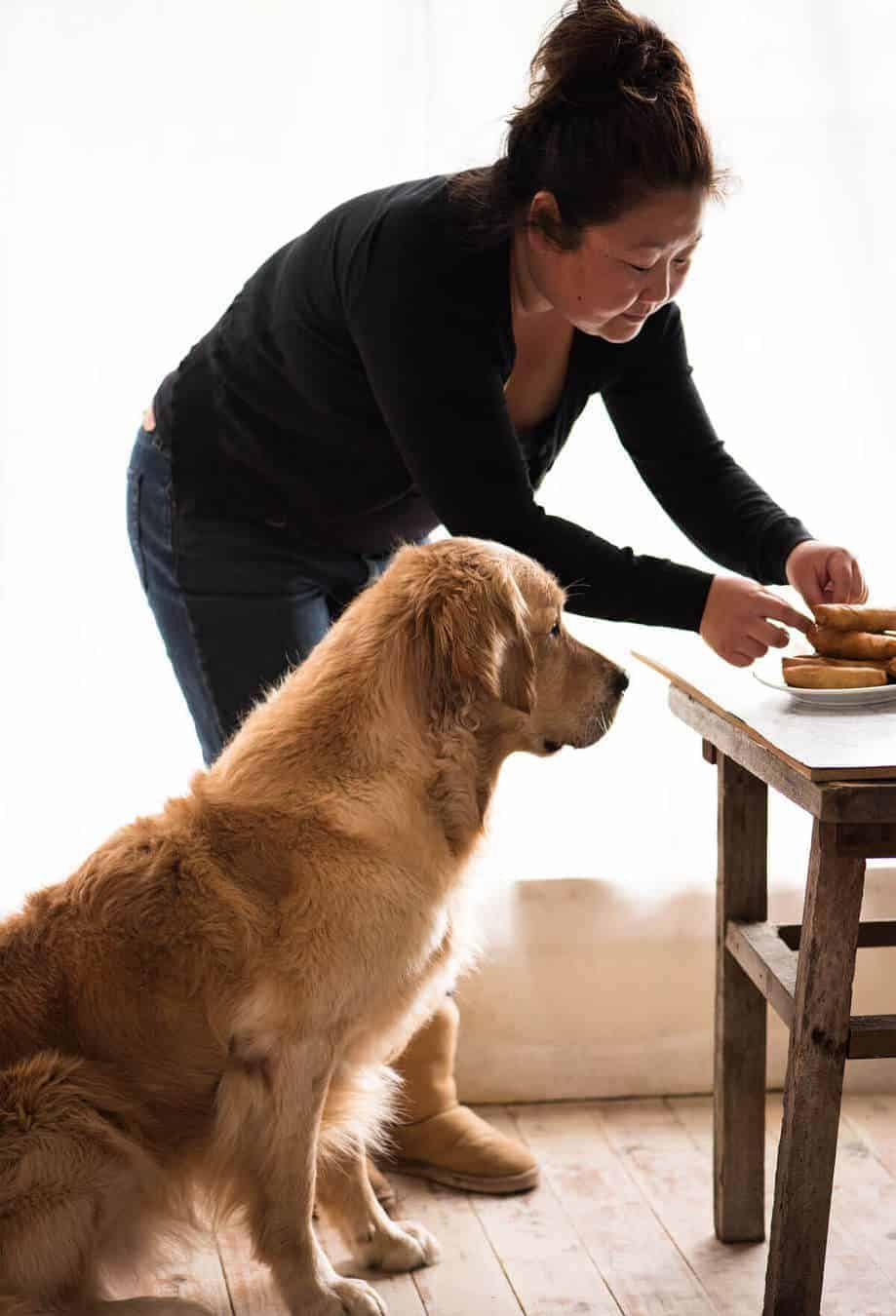 Dozer: thinking that if he stares at the food hard enough, it might jump off the table into his mouth…..