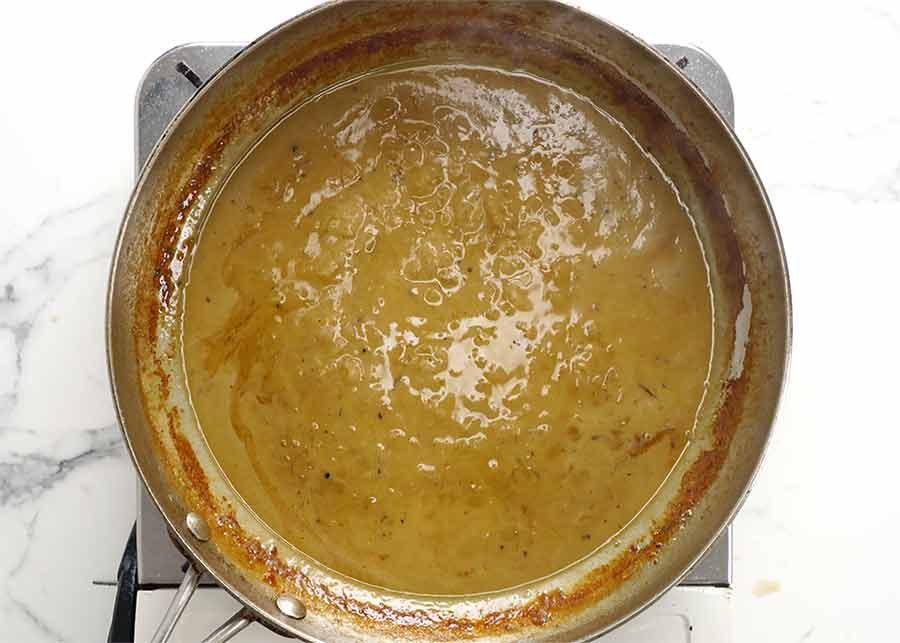 - Add beef stock and let it simmer for 6 to 7 minutes until it reduces by 3/4 (exact time will differ depending on stove strength and pan size).