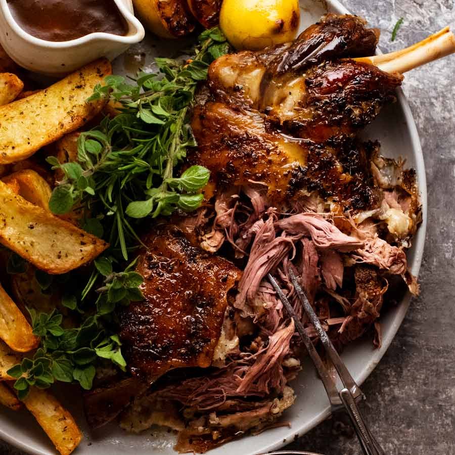 Check meat – Test side of lamb with two forks. The meat should be fall-apart tender. If not, cover and return to oven.